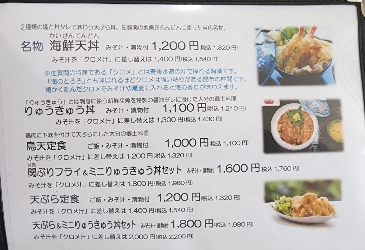 “ 平日お昼の少し前に行きましたが、駐車場の空きはほとんどありませんでした。 店内は和風の座敷や、テーブル席も多くあり、大人数の利用もできるかと思います。 今回は海鮮天丼とクロメ汁を注文しました。 1000円で海鮮の天ぷらはもちろん、ナスやニンジン、カボチャ、大葉など野菜の天ぷらも盛りだくさんでした。 タレと塩が別で付けられており、どちらの味も楽しめるようになっていて、嬉しかったです。 天ぷらの衣はサクサク、中の素材の味を上手く引き立てていて、大変美味しかったです。 注文時に言うと、+220円で味噌汁をクロメ汁に変更することも出来るようでした。 こちらも素材を上手く活かされた味付けで、海鮮天丼との組み合わせも最高でした。 町からは少し離れた所ですが、わざわざ足を伸ばしても食べに行く価値はあると思います。 ”